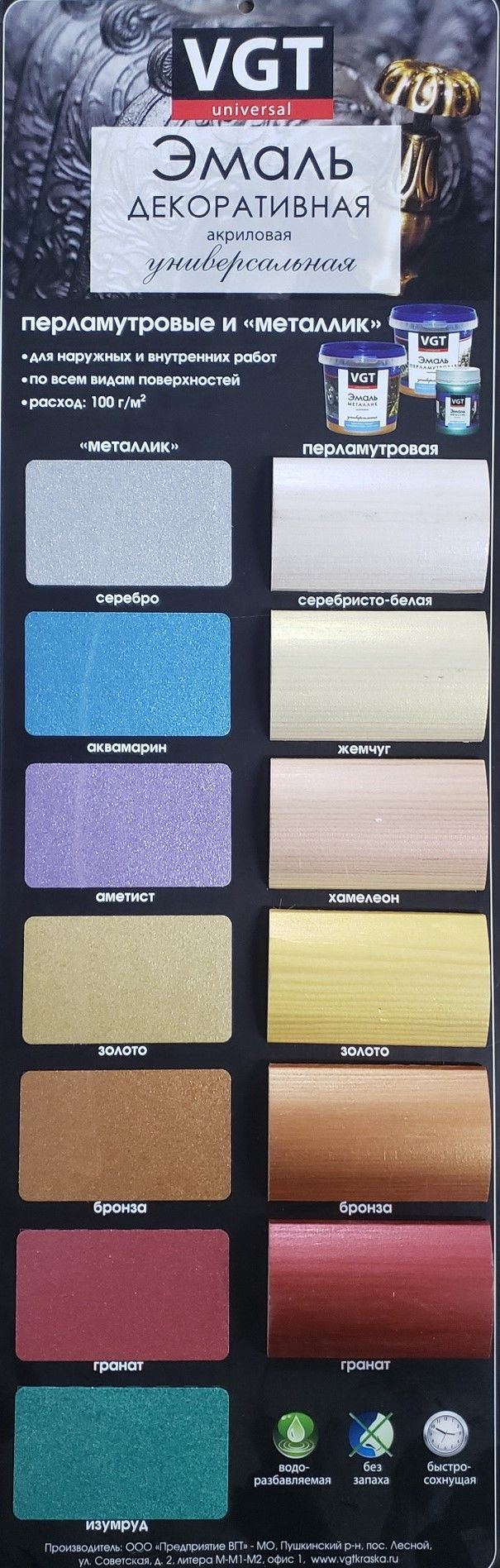 Купите у нас: Эмаль акриловая ВД-АК-1179 Металлик - Универсальная акриловая эмаль с натуральным металлическим блеском, высокой свето-, водо- и атмосферостойкостью. Выпускается в нескольких цветах : «золото», «бронза», «серебро», «аметист», «гранат», «аквамарин», «изумруд» от производителя VGT-ecology material!