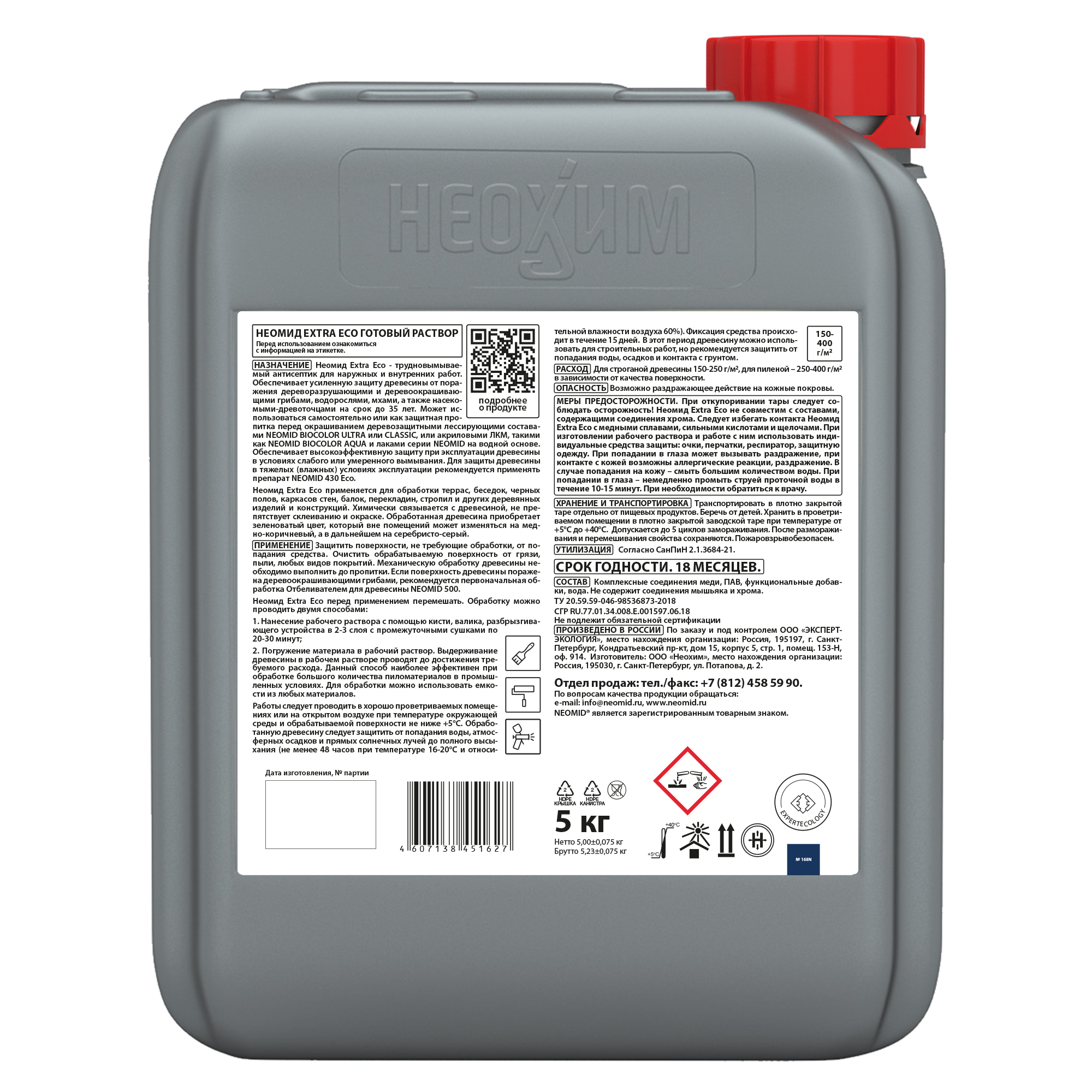 Купите у нас: Extra Eco трудновымываемый деревозащитный состав - Трудновымываемый антисептик для наружных и внутренних работ. Обеспечивает защиту древесины от поражения дереворазрушающими и деревоокрашивающими грибами, водорослями, мхами, насекомыми-древоточцами на срок до 35 лет от производителя Neomid!