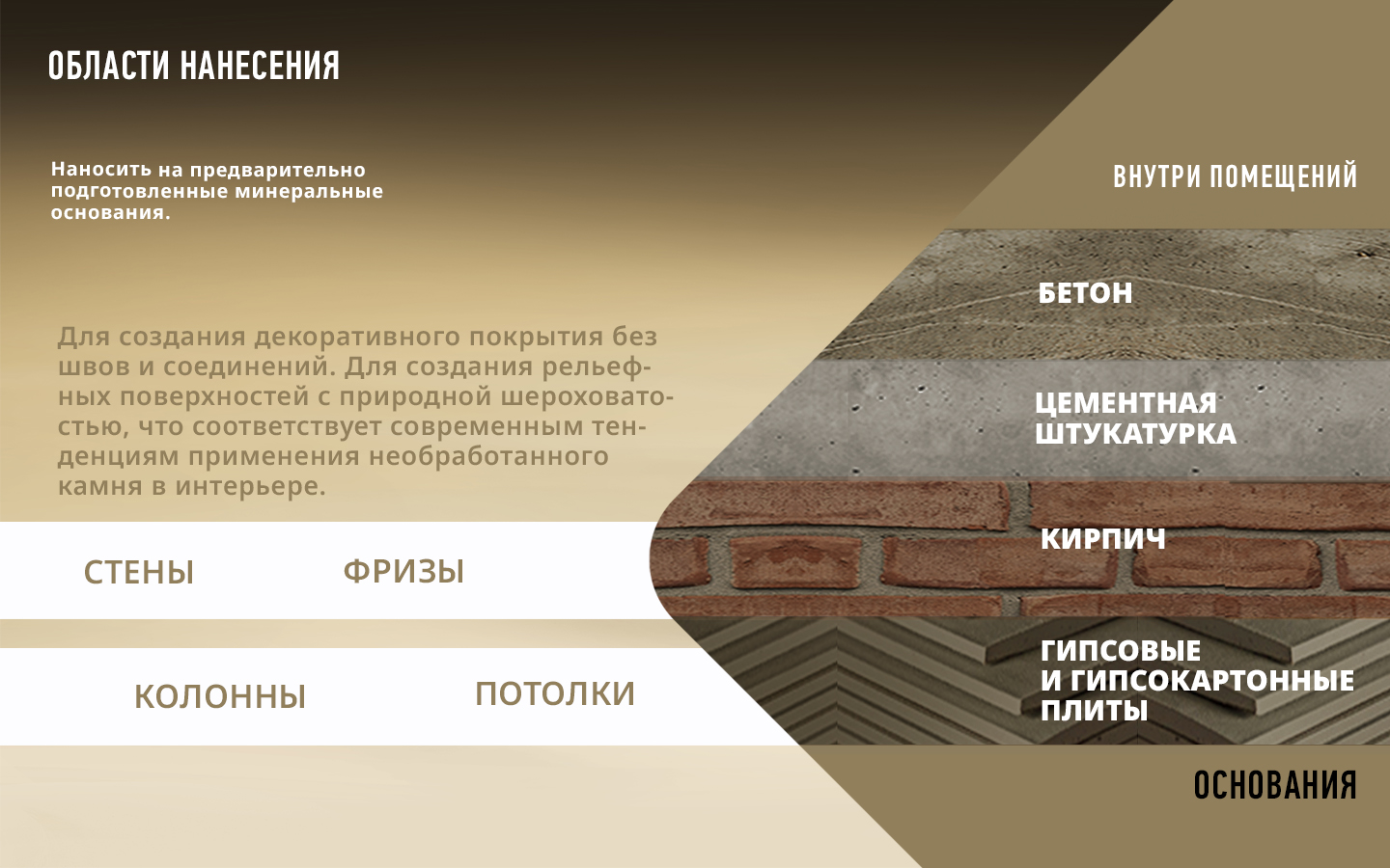 Для создания декоративного покрытия без швов и соединений на стенах, потолках, колоннах, фризах и других архитектурных деталях внутри помещений. Фактурный декоративный материал Rustic используется для создания рельефных поверхностей с природной шероховатостью, что соответствует современным тенденциям применения необработанного камня в интерьере.