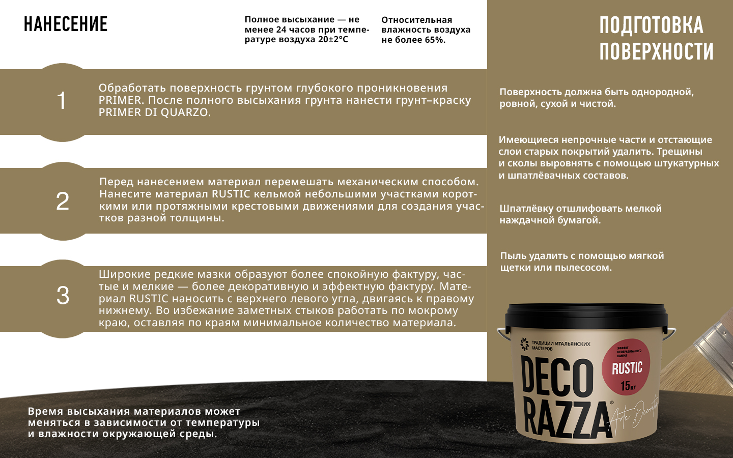 при температуре окружающей среды +22°С и относительной влажности не более 65 %: Грунт глубокого проникновения Primer 2-3 часа, Грунт-краска с кварцевым наполнителем 6-12 часов, Декоративное покрытие Rustic: полное высыхание через 24 часа, влажная уборка не ранее, чем через 28 дней Время высыхания материалов может меняться в зависимости от температуры и влажности окружающей среды. |