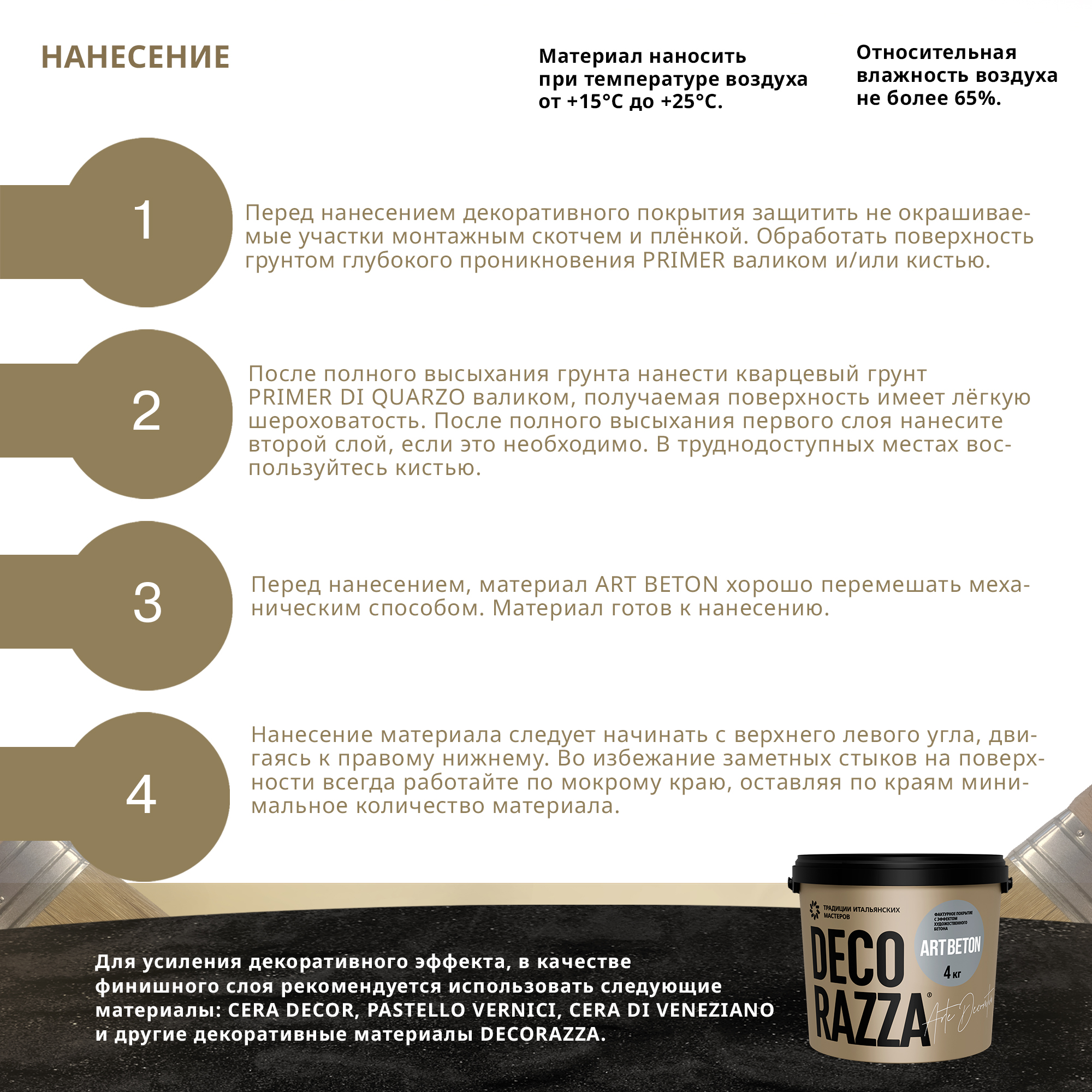Важно! Материал наносить при температуре воздуха 15-25 °С и относительной влажности воздуха не более 65%. Не допускается смешивание с материалами других производителей.