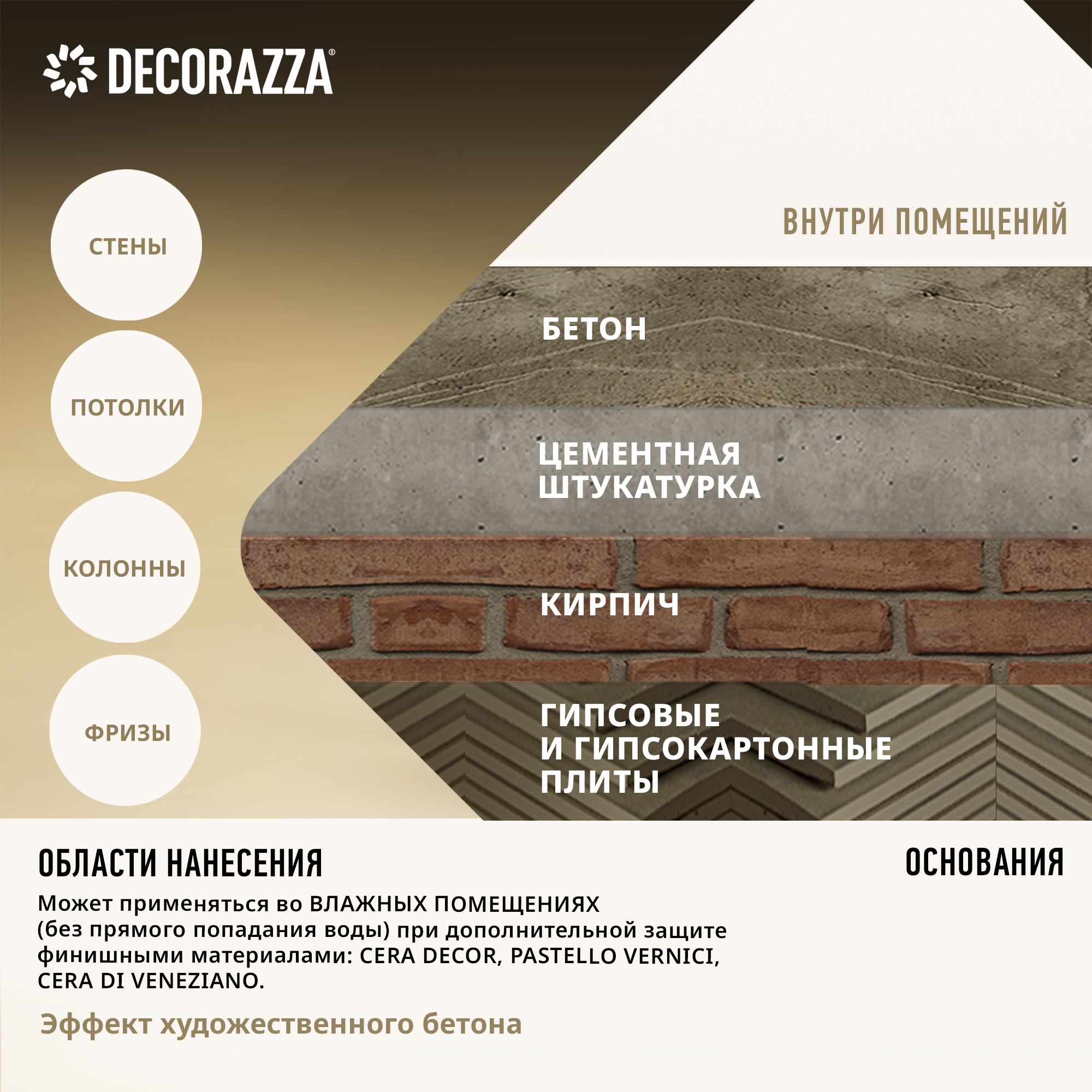 Для создания декоративного покрытия без швов и соединений на стенах, потолках, колоннах, фризах и других архитектурных элементах внутри помещений. Может применяться во влажных помещениях (без прямого попадания воды) при дополнительной защите финишными материалами Cera Décor, Pastello Vernici, Cera di veneziano