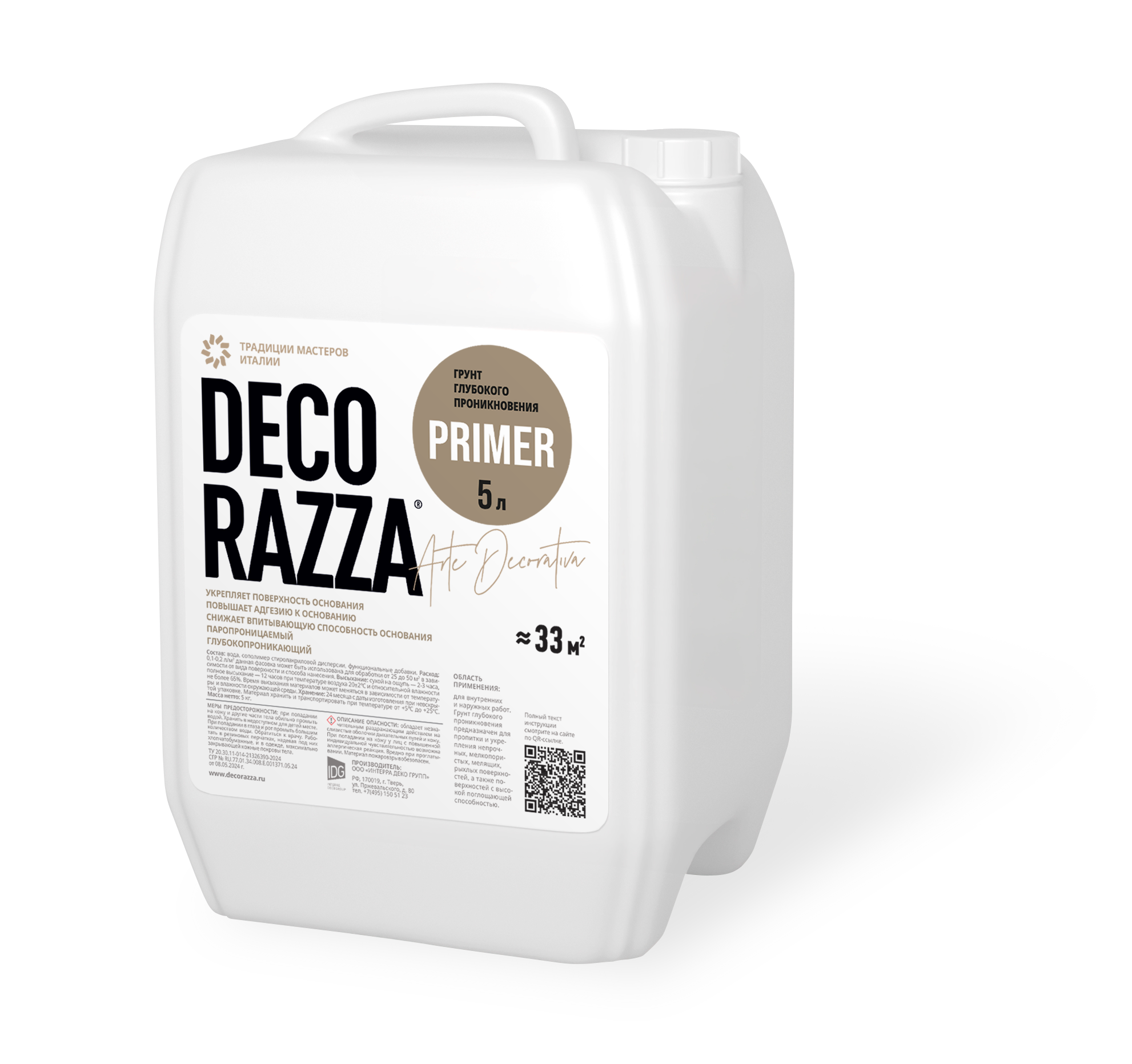 Купите у нас: Грунт глубокого проникновения PRIMER - Грунт Decorazza PRIMER — это высококачественная акриловая грунтовка, специально разработанное для минеральных поверхностей, таких как бетон, кирпич и штукатурка. Этот грунт обладает уникальной способностью глубокого проникновения, что обеспечивает прочное и долговечное сцепление с основанием, обеспечивая идеальную основу под последующие отделочные работы. Основные преимущества Decorazza PRIMER: - Укрепляющий эффект: Усиленный состав укрепляет поверхность, предотвращая образование трещин и отслаивание материала. - Без запаха: Благодаря экологичным компонентам, продукт не имеет неприятного запаха, делая его идеальным выбором для помещений с повышенными требованиями к качеству воздуха. - Проникающее действие: Глубокое проникновение грунтовки в поры поверхности обеспечивает надежную адгезии и устойчивость к влаге. - Широкий спектр применения: Идеально подходит для использования на бетонных, кирпичных и штукатурных поверхностях. Decorazza PRIMER гарантирует качественное основание для любых декоративных покрытий, обеспечивая их долговечность и устойчивость к внешним воздействиям. от производителя Decorazza!