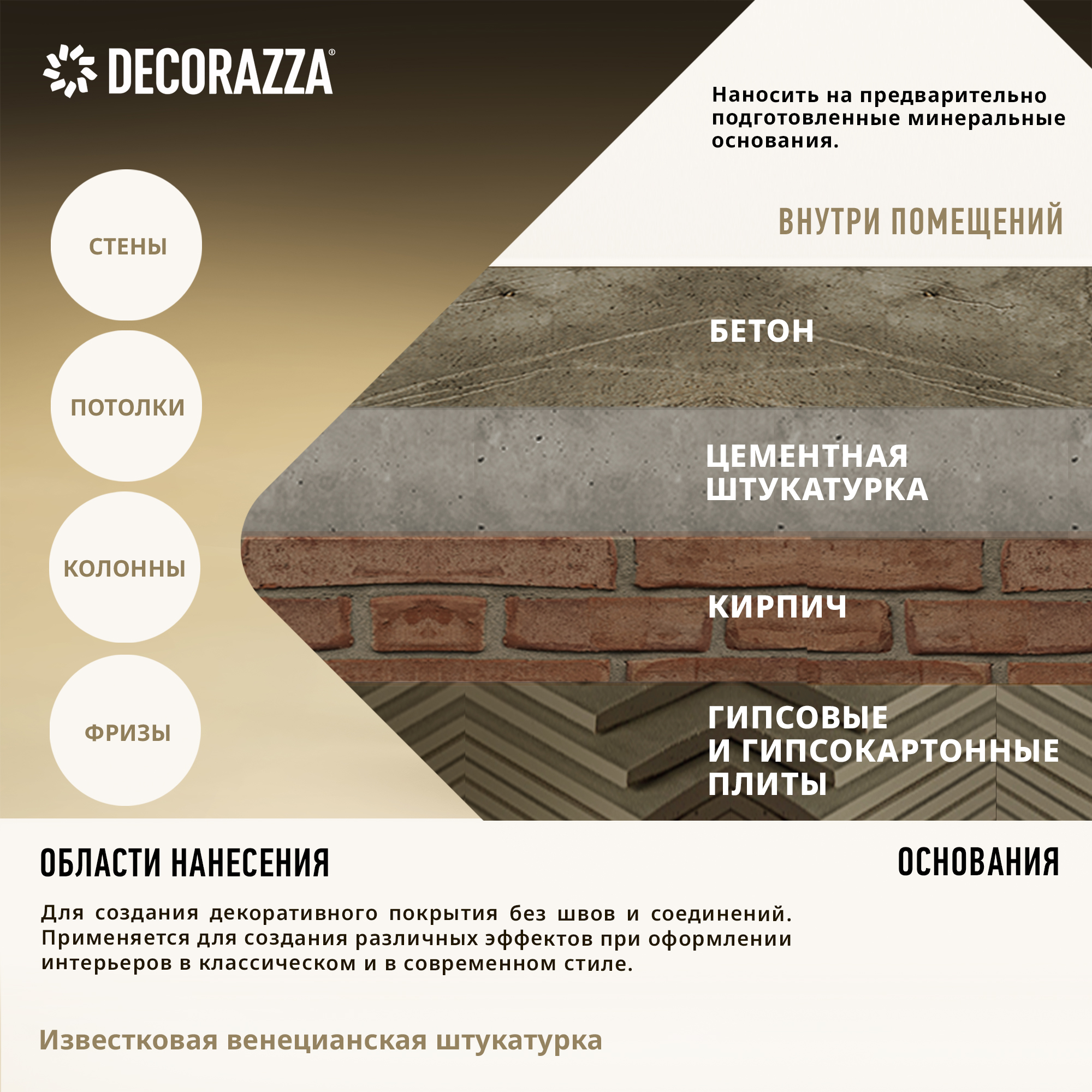 Подготовка поверхности и условия нанесения: Наносится на предварительно подготовленные минеральные основания. Поверхность должна быть ровной, сухой, прочной и чистой, без следов масел и жира. Обработать основание грунтом глубоко проникновения Primer ТМ Decorazza. Затем нанести грунткраску Base ТМ Decorazza так, чтобы поверхность была идеально гладкой. Calce Veneziana наносят после полного высыхания Base при температуре воздуха и поверхности 10-25°С и относительной влажности воздуха до 65%. Расход: 0,5-0,7 кг/м² при классическом нанесении
