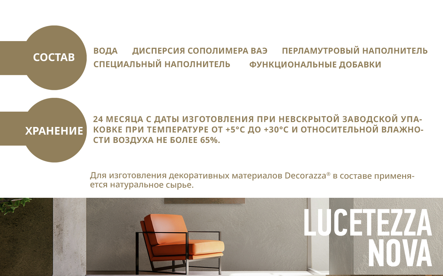 Декоративная краска Lucetezza с перламутром и кварцевыми частицами позволяет создавать запоминающиеся эффекты с переливами и переходами цвета, в том числе роскошный «Клондайк NERO» и брутальный декор «Сварные швы». Материал выпускается в 5 базах: серебро, золото, алюминий, бронза, медь, может колероваться в спокойные пастельные и яркие оттенки. Формируемое покрытие с легкой песчаной структурой устойчиво к влажной уборке, экологично, изысканно смотрится в классических и современных интерьерах фотостудий, гостиных, спален, прихожих, столовых в загородных домах, кабинетов и конференц-залов в офисах и на других объектах. Средний расход не превышает 0,2 л/м2.