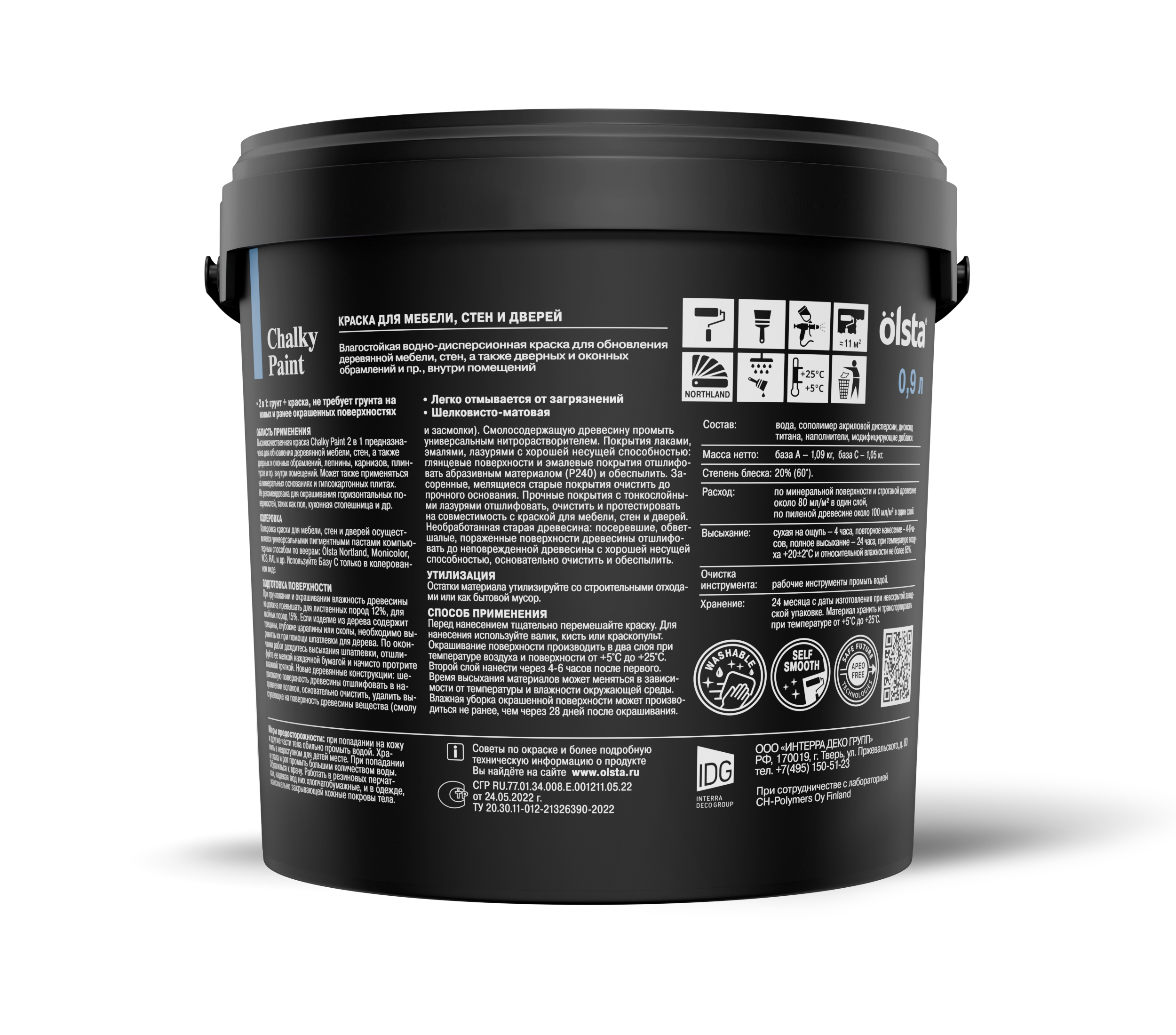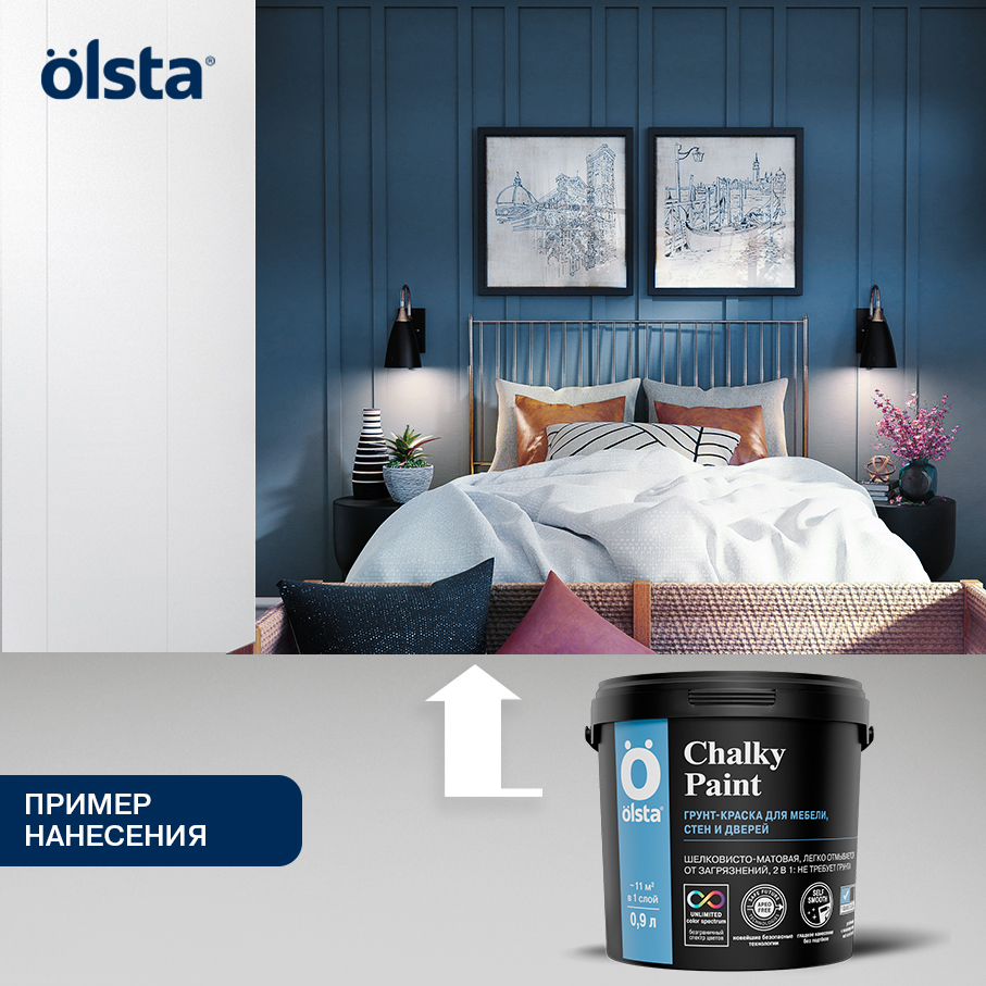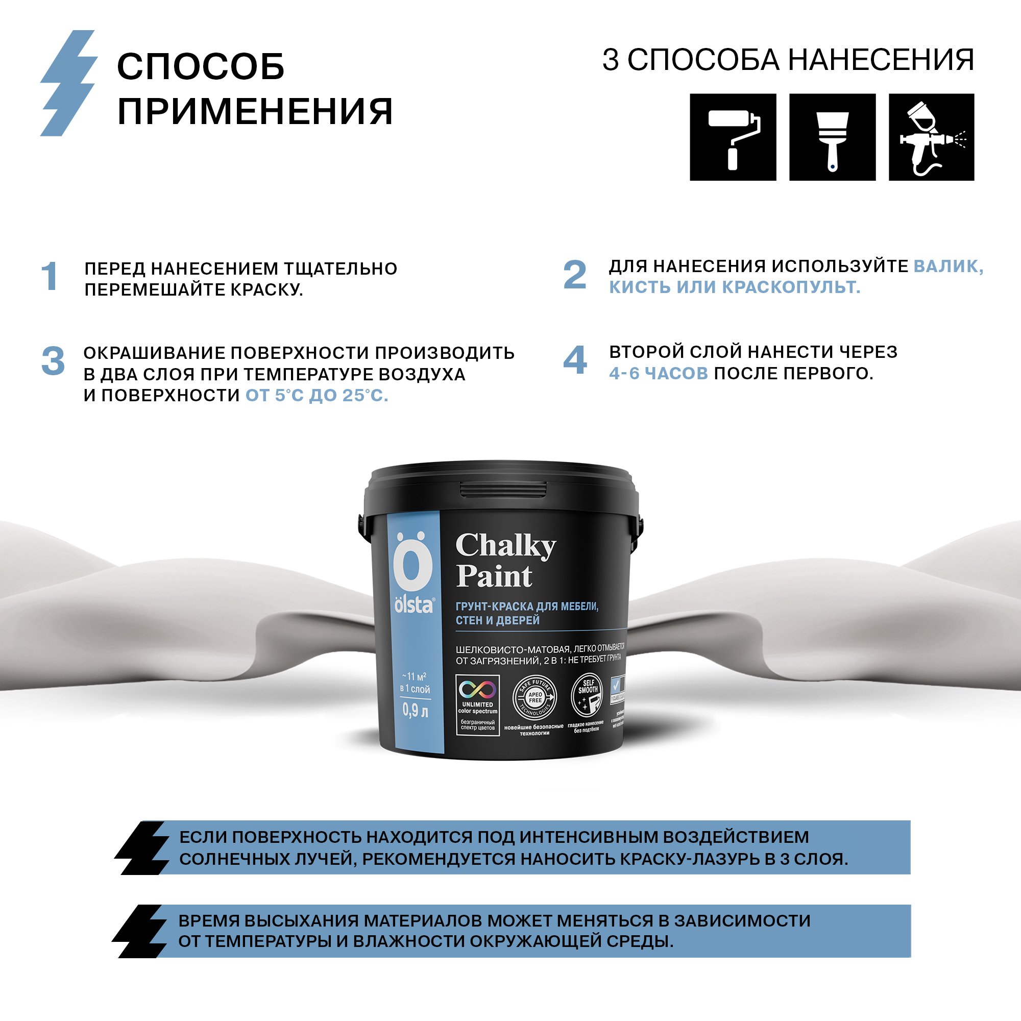 Купите у нас: Краска для мебели меловая CHALKY PAINT - Краска для мебели меловая OLSTA CHALKY PAINT — идеальный выбор для тех, кто ценит качество и экологичность. Эта мебельная краска отличается уникальным матовым покрытием, которое придает мебели уютный и стильный вид. Благодаря водной основе, она абсолютно безопасна и не имеет неприятного запаха, что делает процесс окрашивания комфортным даже в закрытых помещениях. OLSTA CHALKY PAINT известна своей стойкостью к износу и механическим воздействиям, обеспечивая долговечное покрытие, которое сохранит свой первозданный вид на протяжении многих лет. Экологичные компоненты краски делают её безопасной для окружающей среды и домашних животных, делая её предпочтительным вариантом для современных интерьеров. от производителя OLSTA!