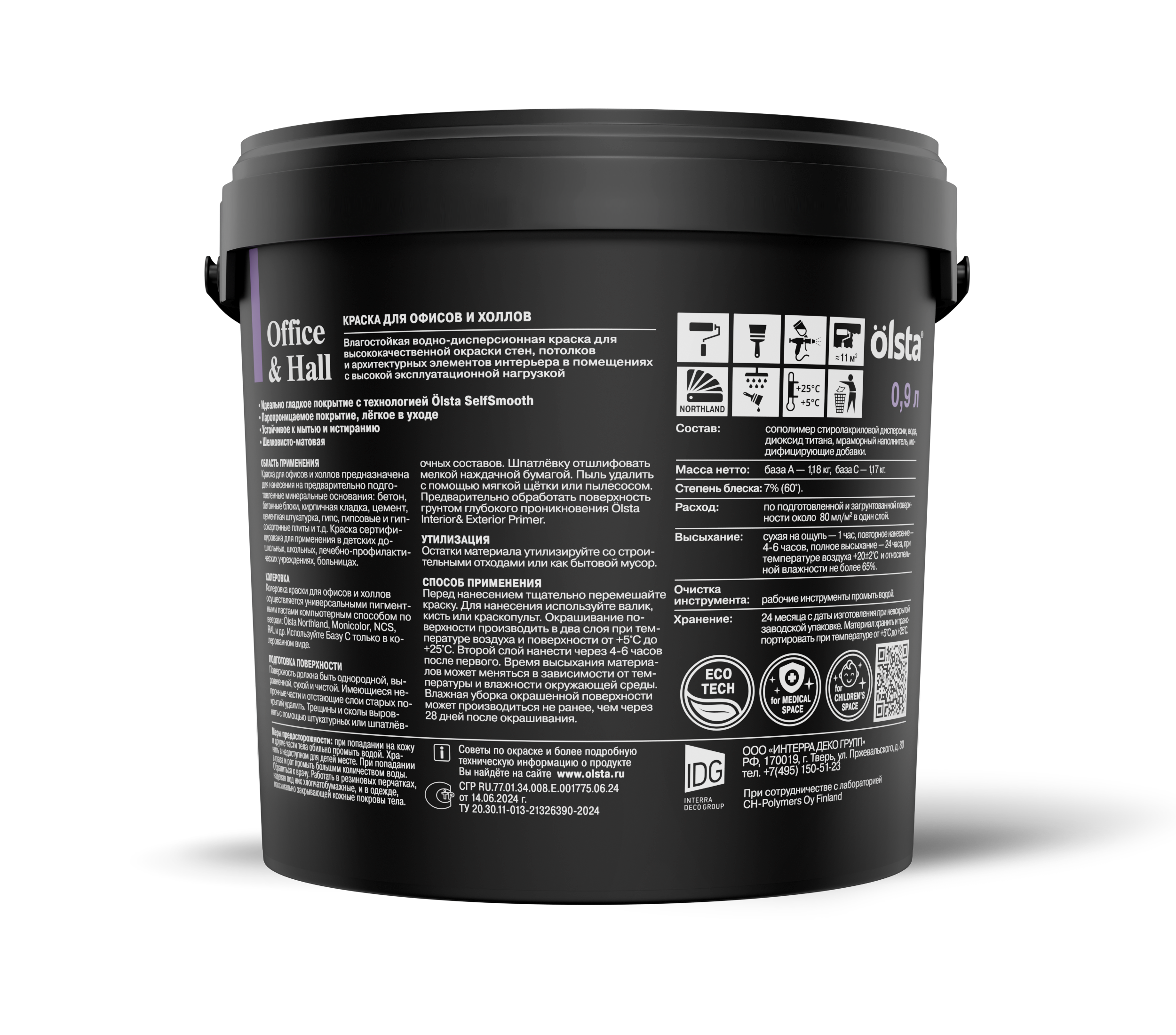 Изготовленная по особой технологии с повышенным количеством акрилового связующего краска Olsta Office & Hall обеспечивает высококачественное окрашивание стен в вестибюлях, офисах, холлах и на других объектах, предполагающих высокую эксплуатационную нагрузку. Материал создает матовое влагостойкое покрытие, отличающееся паропроницаемостью, простотой ухода, устойчивостью к мытью и истиранию.