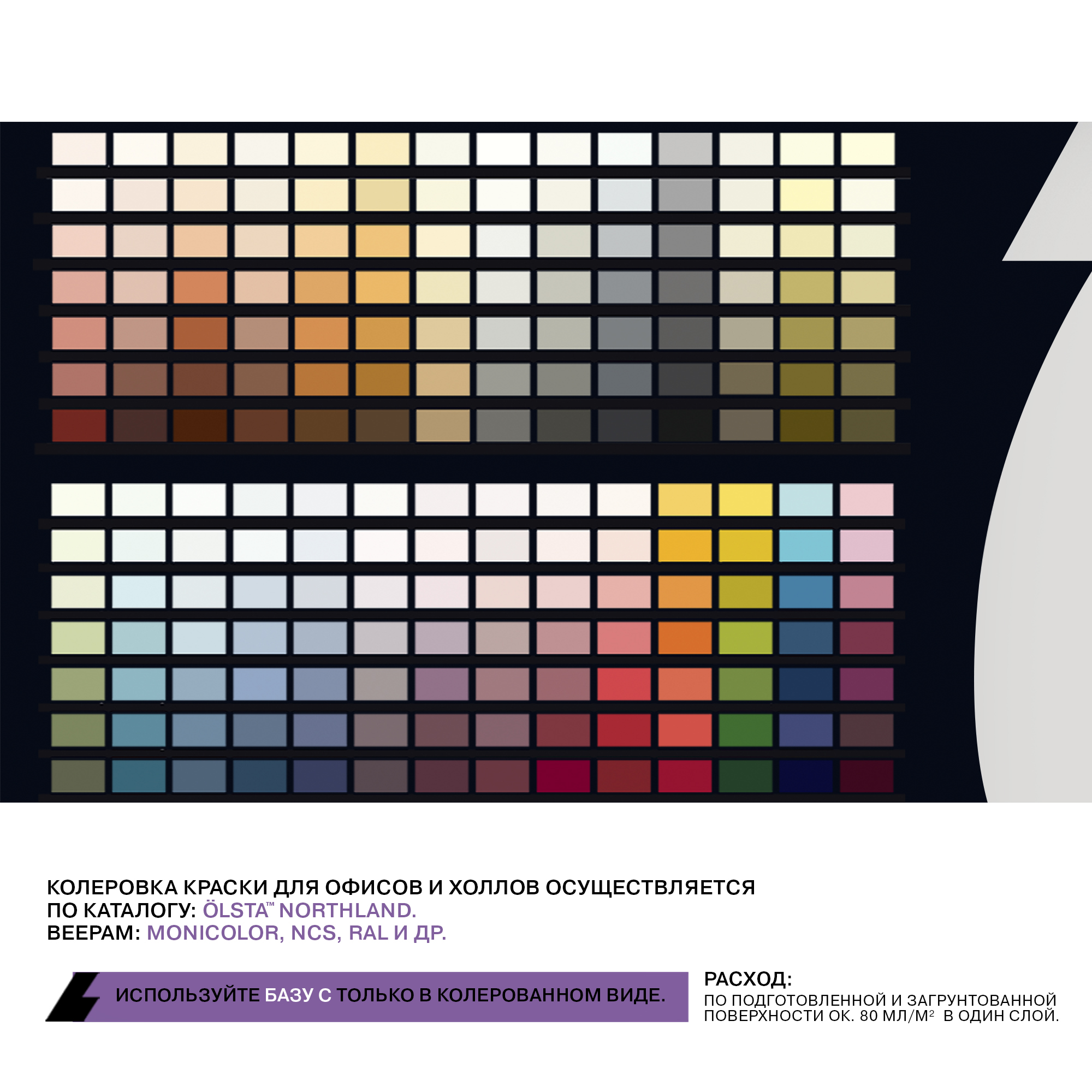 Названия цветов: | Белый; Основа C - для колеровки в насыщенные тона, компьютерная колеровка по согласованию. |