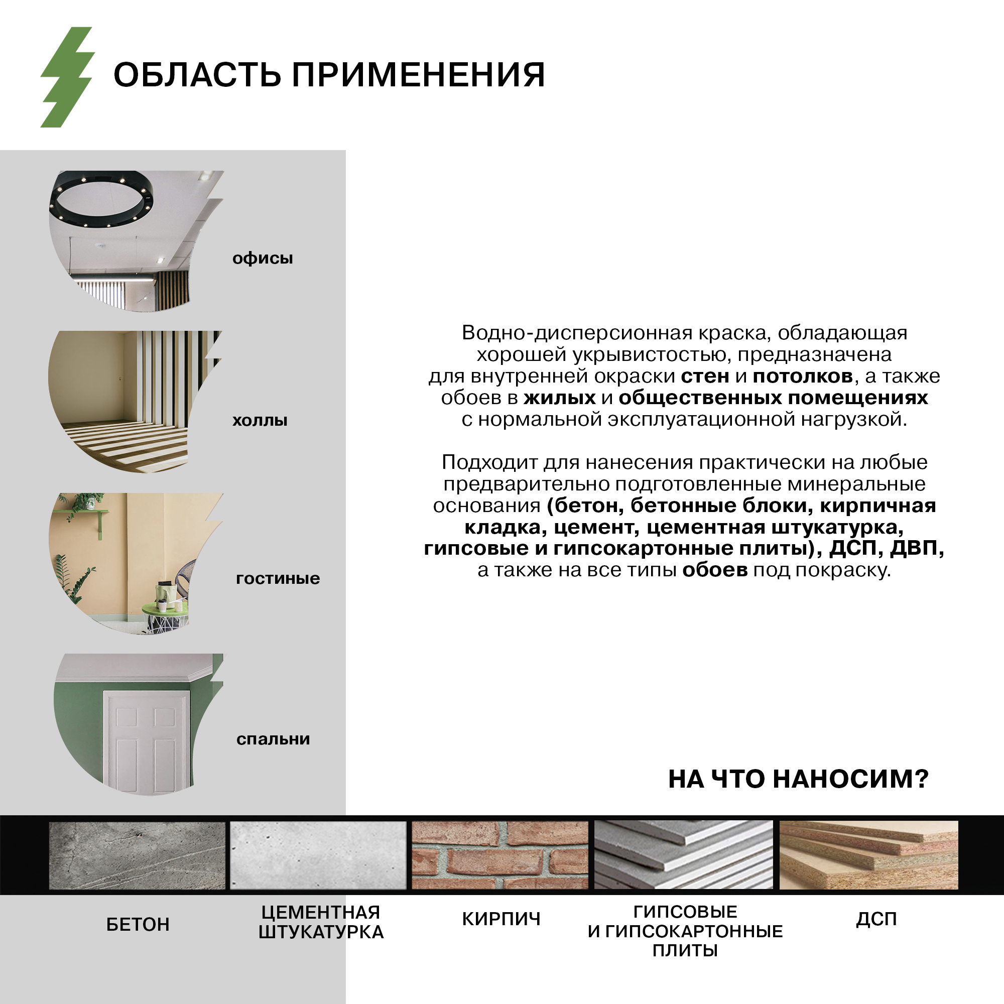 Водно-дисперсионная краска, обладающая хорошей укрывистостью, предназначена для внутренней окраски стен и потолков, а также обоев в жилых и общественных помещениях.