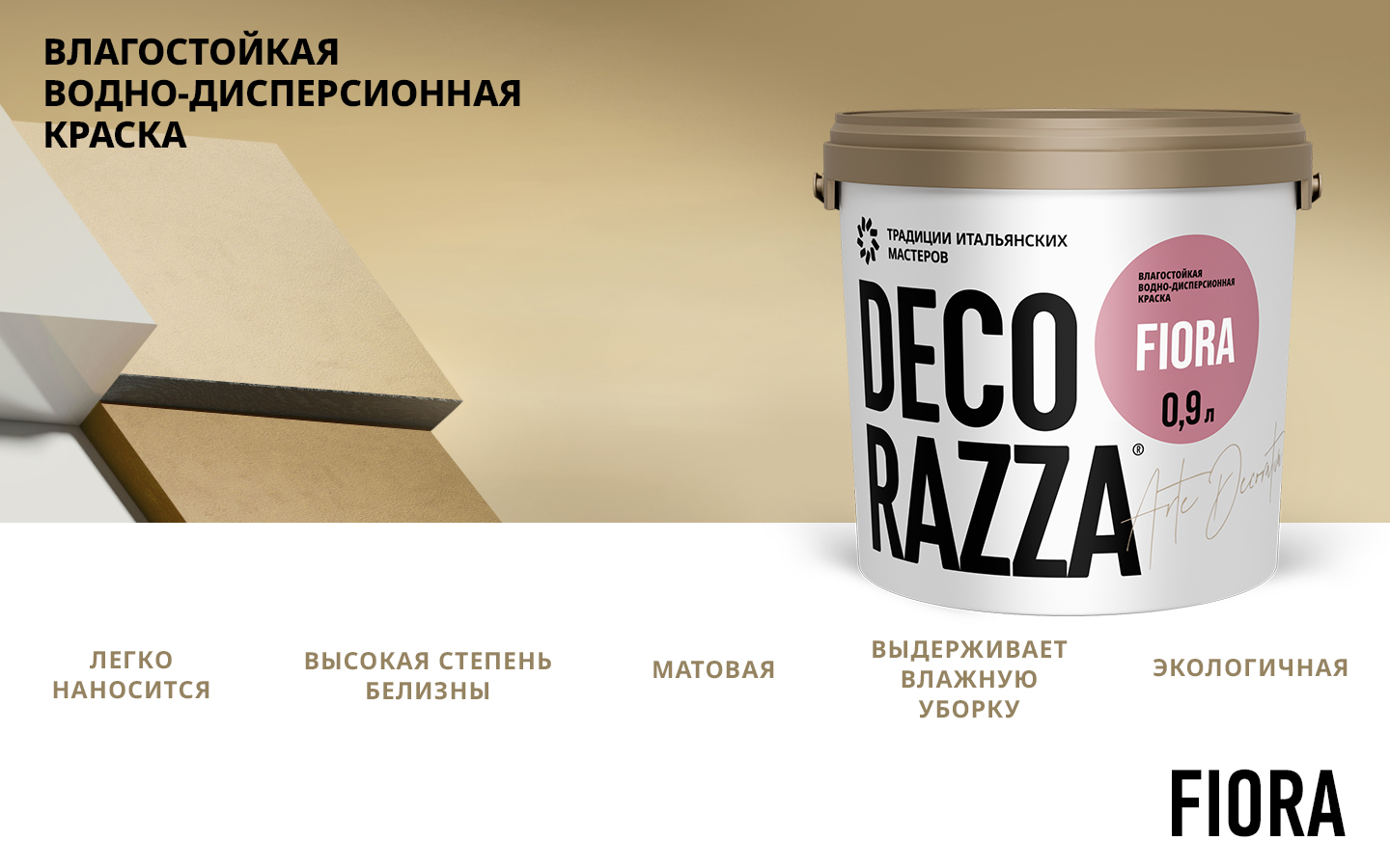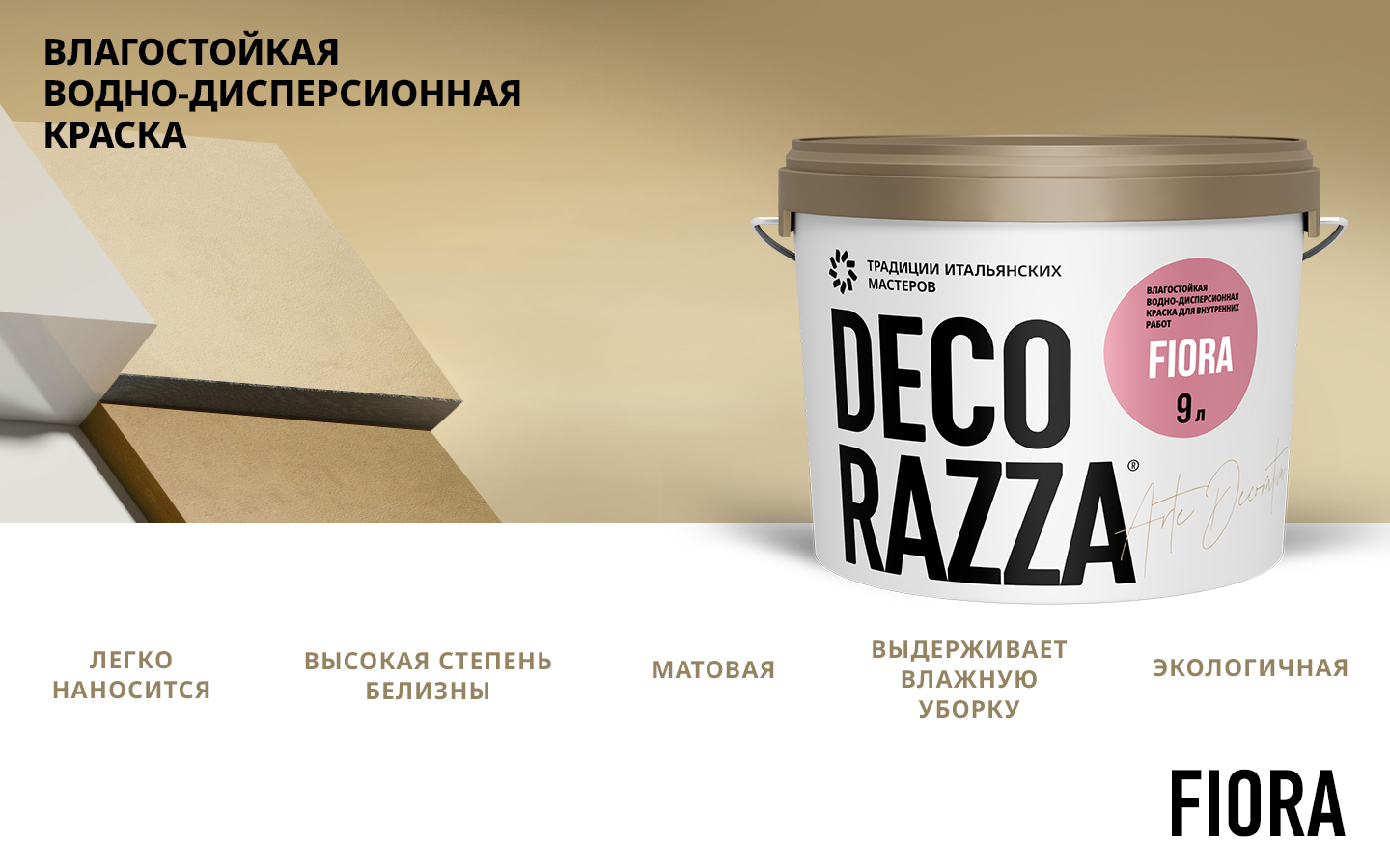 Купите у нас: Влагостойкая интерьерная краска FIORA - Износостойкая краска для помещений с высокой эксплуатационной нагрузкой от производителя Decorazza!