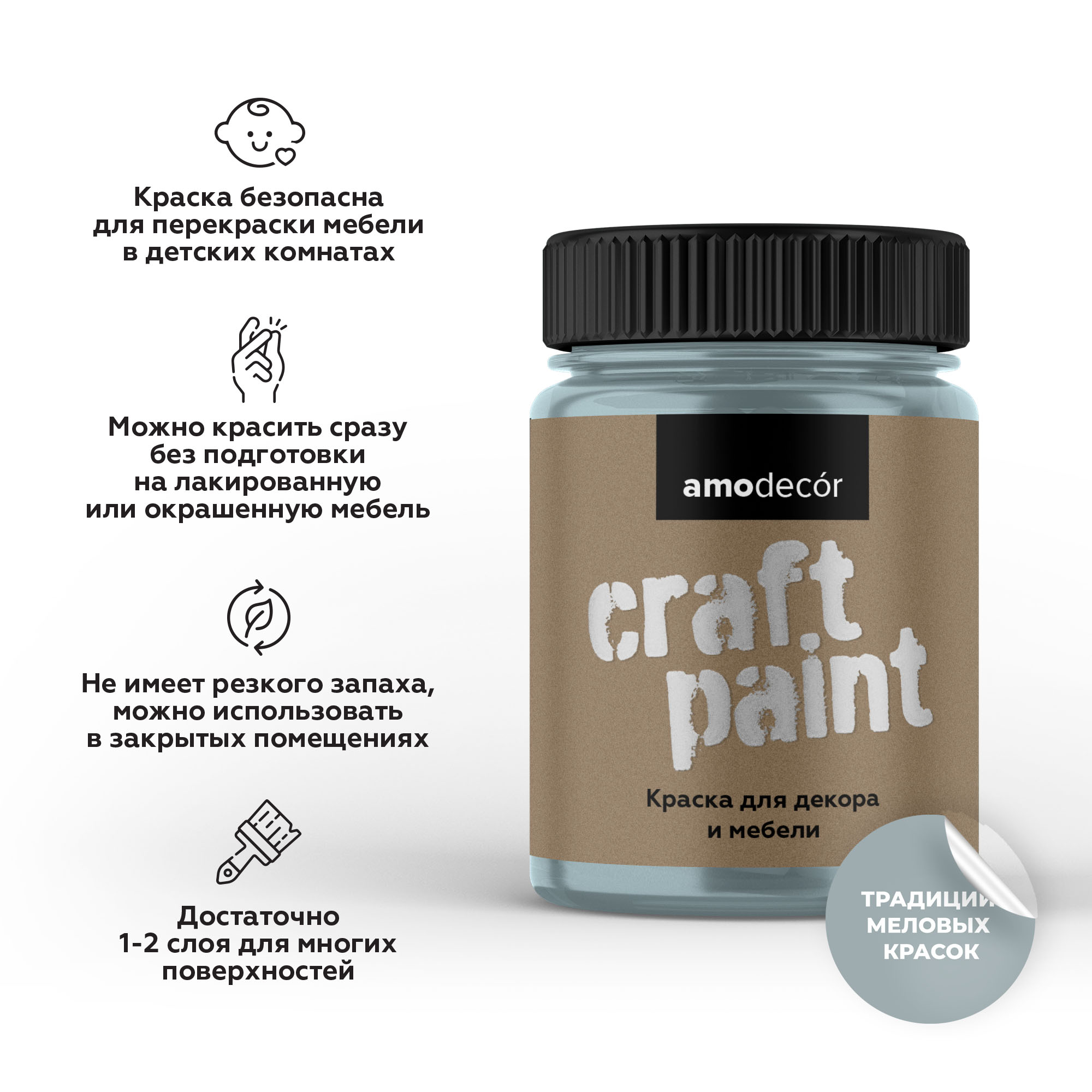 Меловая краска для мебели АМОdecor — это идеальный выбор для обновления вашего интерьера! Благодаря своей мебельной природе и использованию на водной основе, она обеспечивает легкость нанесения и быстрый процесс высыхания. Отличительной чертой этой краски является её экологичность и отсутствие запаха, что делает её безопасным решением для внутренних работ в жилых и офисных пространствах. Матовый финиш АМОdecor позволяет добиться нежного и благородного вида поверхности, подчеркивая детали декора и создавая уютную атмосферу. Её декоративная способность открывает простор для творчества, позволяя вам создавать уникальные дизайнерские решения и трансформировать любую мебель в произведение искусства. Эко-подход и простота использования делают эту краску незаменимым инструментом для всех, кто ценит качество и заботу о природе.